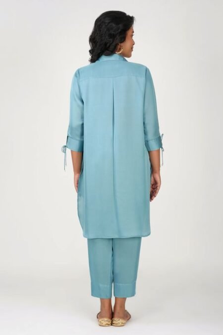 ₹15,000.00Crepe highlow tunic with contrasting back and sequinned Handembroidery on the neck teamed with draped pants.