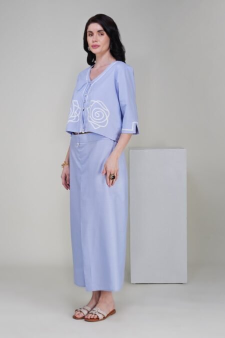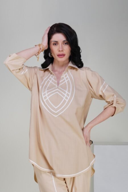 ₹14,000.00Waffle knit Co ordset with highlow shirt style tunic and embroidery in katdanas teamed with loosed draped pants.