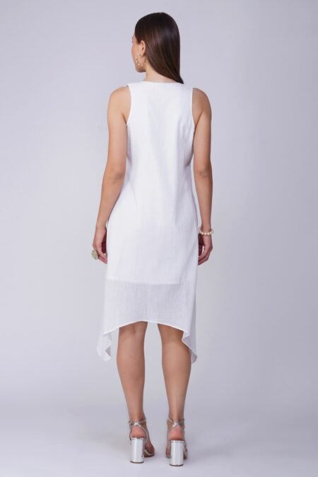 White cotton crinkled cotton dress with neck detail g and asymetric hemline.
