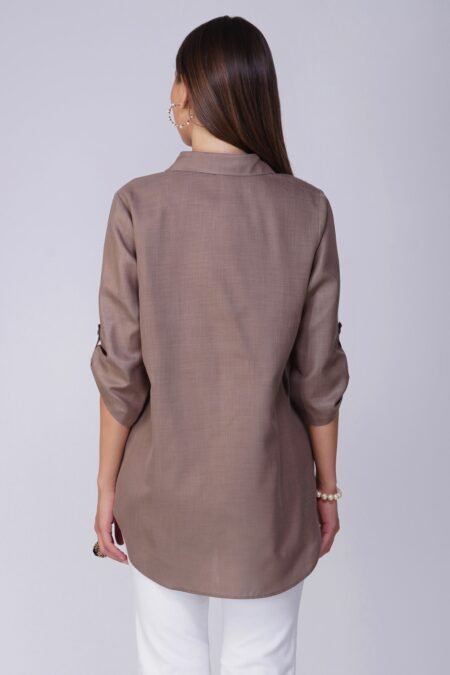 Cream satin tunic dress embroidered with pearl and mother of pearls around the neck and knotted hem detailing.