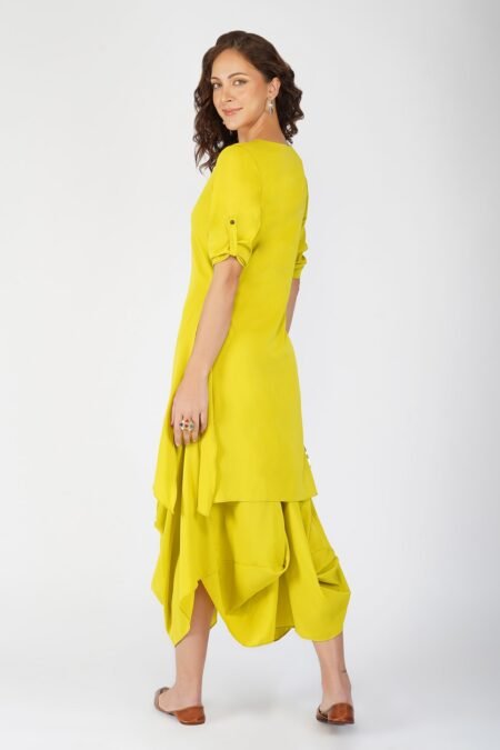 Beige pleated asymmetric wrap around dress with a knit inner.