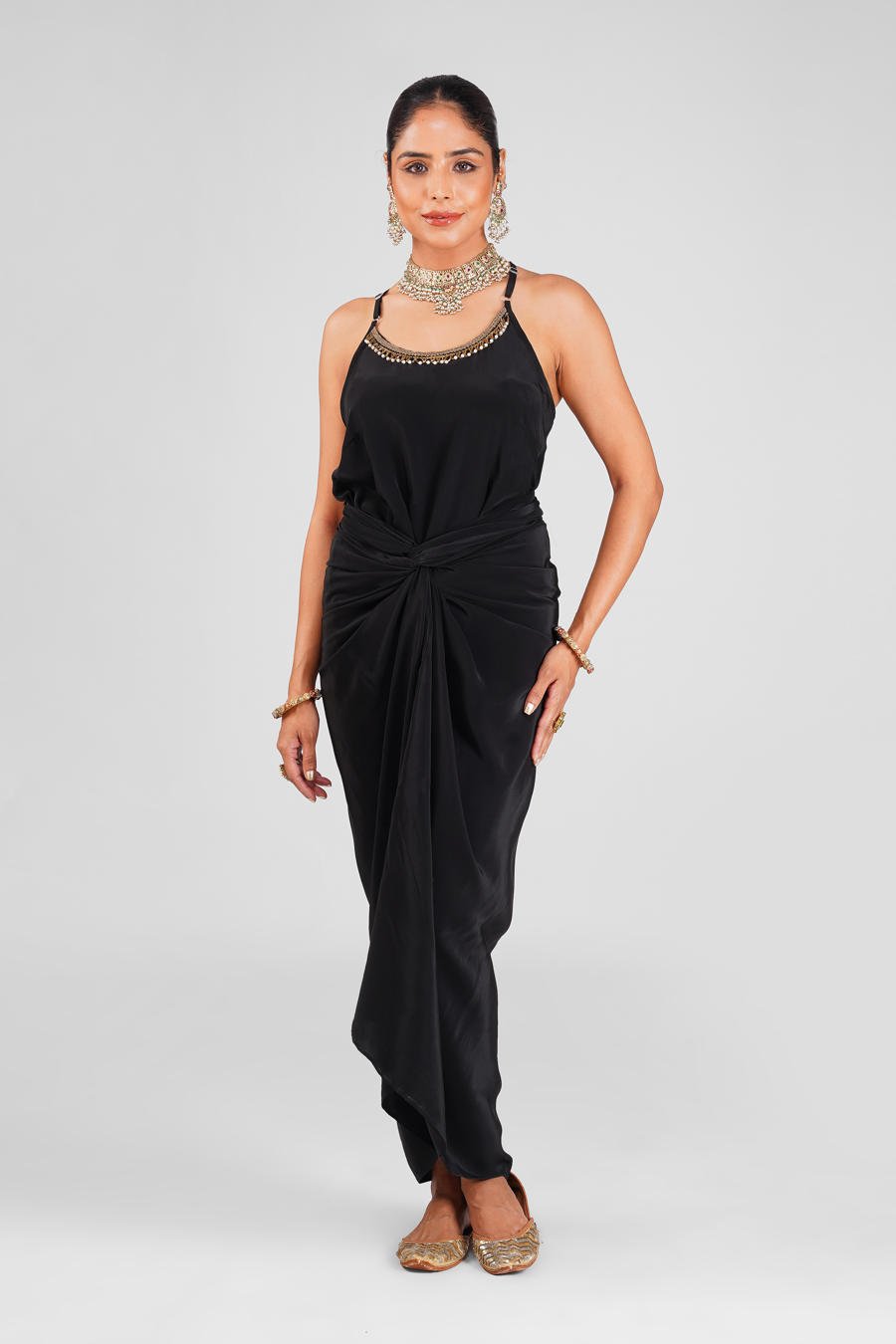 Crepe and shimmer chinnon come together in this skirt-drape set, merging ease with striking evening allure.
