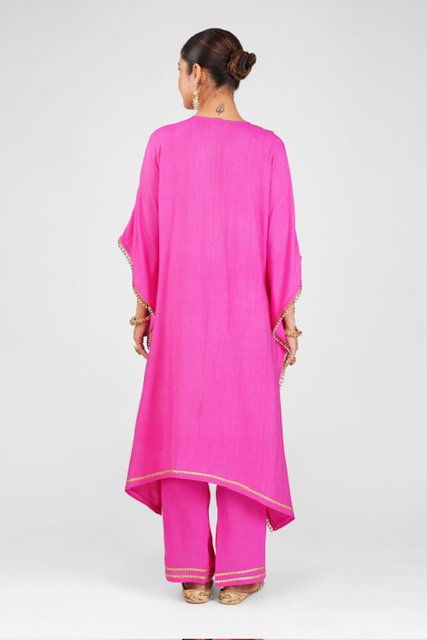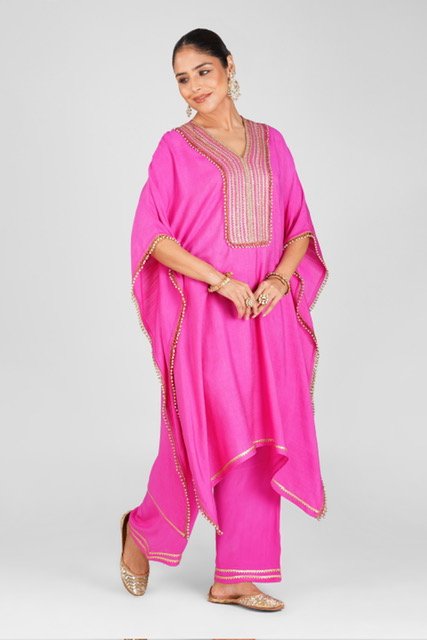 In radiant Chanderi and crepe, this flowing silhouette is equal parts comfort and understated luxury.